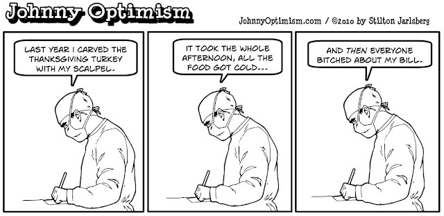 Daughter Jarlsberg continues to recover quite nicely from her “giant thing-ectomy.” Yesterday ("a day without a doctor visit is like a day which I can’t even imagine") she had a 2-week follow-up appointment and the doctor was well pleased with how she’s coming along. He also pulled out half the metal staples from her long, long incision and the rest should come out two weeks from now. Or sooner if she doesn't stop picking at them.